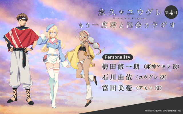 19:30 – 20:00 永久のユウグレ もう一度君に出会うラジオ 梅田修一朗、石川由依、富田美憂 MBS/TBS系28局「スーパーアニメイズムTURBO」枠にて放送のTVアニメ『永久のユウグレ』を盛り上げるラジオ番組『永久のユウグレ もう一度君と出会うラジオ』! 12月21日(日)19時30分~お届けする第4回の放送は、“姫神アキラ”を演じる梅田修一朗さんと“ユウグレ”を演じる石川由依さん、“アモル”を演じる富田美憂さんがパーソナリティを担当します!! 【TVアニメ『永久のユウグレ』】 アニメ公式HP:https://towanoyuugure.com/ アニメ公式X:@towanoyuugure 推奨ハッシュタグ:#永久のユウグレ もっと見る